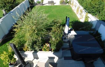 Nagy méretű terasz jakuzzival, infraszauna, kettő emeleti erkély a család kényelmét szolgálja.