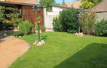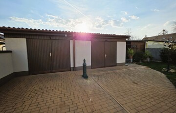 A rendezett udvar térkövezett és füves részekkel, mediterrán növényekkel kialakított. A 18 m²-es grillterasz és a dupla, összesen 56 m²-es garázs tovább növeli az ingatlan értékét.