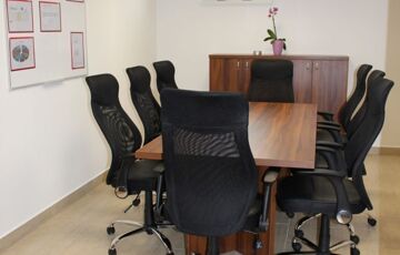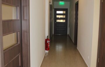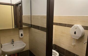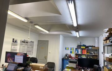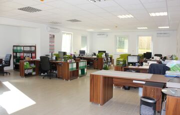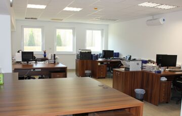 A két szintes ~462 m2 hasznos alapterülettel rendelkező iroda épület, sáv alapra, 30-as tégla falszerkezettel, monolit vasbetongerendás födémmel épült, a homlokzati szigetelés 15 cm-es grafitos Dryvit rendszer, a nyílászárók műanyagból készültek. Az irodaépület földszintjén a recepcoión és a wc és modókon kívül három "normál" méretű, és nagy nagy méretű iroda helyezkedik el. Az alaprajzok és a helyiséglista a fotók között megtalálható. Az emelti részen találhatók az üzemi rész öltözői, zuhanyzói, a kazánház és a konyha-étkező, ami nagyobb meetingek, bemutatók tartására is alkalmas.