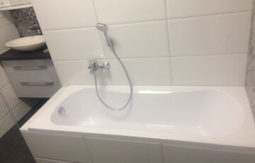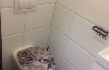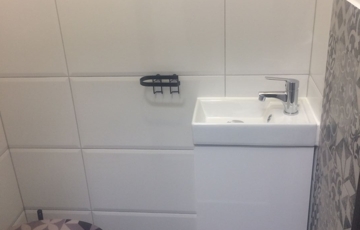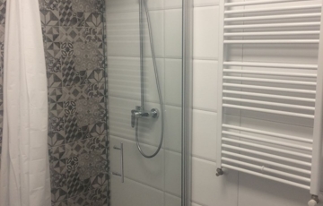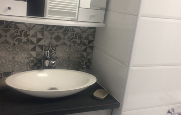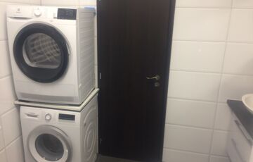 A fürdőszoba zuhanyzóval, káddal, mosó és szárítógéppel felszerelt, külön wc kézmosóval, a konyha elektromos főzőlappal és mosogatógéppel is ellátott.