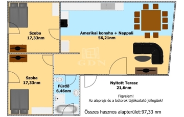 - amerikai stílusú konyha + nappali,