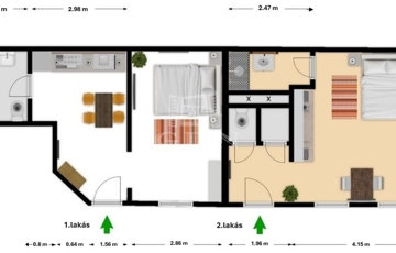 28 nm alapterület: közlekedő, WC, kamra, amerikai konxhás nappali szoba, fürdőszoba