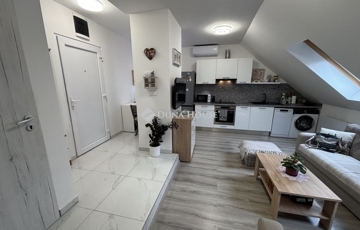 Szombathely déli kertvárosi részén, az interspar közelében található 4 lakásos társasház 2. emeletén, 2023-ban került átadásra a lakás. A tetőtéri ingatlan nettó 36, bruttó 45 m2, kialakítása nappali+konyha, hálószoba, fürdő, külön wc és fedett terasz. Kiváló elosztású, élhető kis lakás, praktikusan berendezve, műszakilag és esztétikailag is szinte új állapotú! A vételár tartalmazza az ingatlan teljes berendezését, a gépesített konyhát, a méretre készült szekrényeket, az ülőgarnitúrát a hálószoba-bútort, lámpákat, függönyöket stb. plusz a zárt udvaron egy 16 m2-es garázst is!