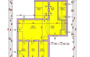 A földszinten előtér, szoba, mellékhelyiség és egy 15 m2-es erkély található. Az emeleten tágas amerikai konyhás nappali, 3 szoba, egy nagyobb fürdőszoba (kád és zuhanyzó is van benne) és egy 15 m2-es erkély került kialakításra.