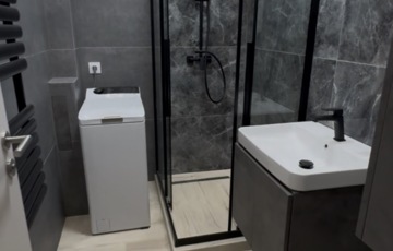Exkluzív fürdőszoba: Prémium burkolatokkal, hangulatos világítással és magas minőségű szaniterekkel felszerelt helyiség.