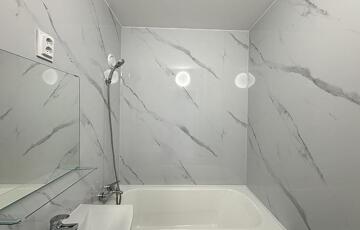 A fürdőszoba új burkolatot kapott és új akrilkáddal rendelkezik. A mosógép ebben a helyiségben kapott ki- és beállást, a WC egy külön helyiségben található.