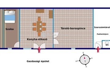 Az ingatlan aszfaltúton közvetlenül megközelíthető, panorámás a környező szőlőskertekre és dombokra. A tégla építésű, több mint 90 m2 pince és présház, a közel 3000 m2-es telek aszfaltúttal szomszédos szélén helyezkedik el, enyhén lejtős terület magaslati részén. Esztétikus kialakítása kiemelkedően jó lehetőségeket biztosít. Felújítása megkezdődött, használatba vehető állapotú, de igény szerint a vizesblokkot még ki kell alakítani.