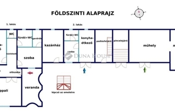 A földszint 110 m2-en tágas nappali, konyha-étkező, 1 szoba, 2 gardrób, fürdő+WC, külön WC, közlekedő, veranda elosztású.