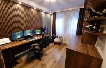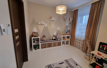A lakásba belépve az előszobából jobbra egy szoba, balra egy zuhanyzóval ellátott fürdőszoba nyílik, szemben a kertkapcsolatos, kandallóval felszerelt nappali és a konyha található. A lépcső alatt kamra kapott helyet. Az emeletre felérve a közlekedőből jobbra nyílik egy hálószoba (12,5 m²) erkéllyel (3,2 m²), és egy fürdőszoba (7,6 m²), balra szintén egy szoba + gardrób (21 m²) erkéllyel (4,5 m²) – itt két szoba egybe lett nyitva. A padlástér jól szigetelt (20 cm padlap), tiszta tárolóhelyiségnek lett kialakítva, amely 57 m²-es, betonfödémes (beépíthető). A lakótér 110 m² + 20 m² terasz + 2 erkély 8 m².