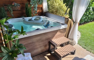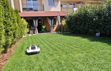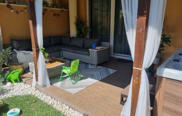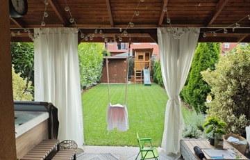 A földszinti terasz fedett, így télen-nyáron remekül használható, egy 4 személyes jakuzzinak és kerti ülőgarnitúrának is helyet ad. A kertben a gyepszőnyeg, az örökzöld tuják és a babérmeggy sövény öntözését automata locsolórendszer biztosítja. A kert végében található egy kb. 4 m²-es faház a kerti szerszámok tárolására.