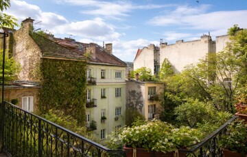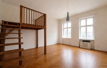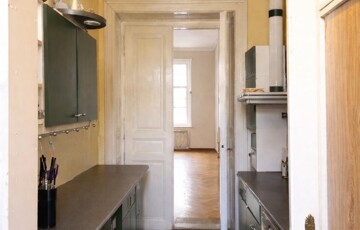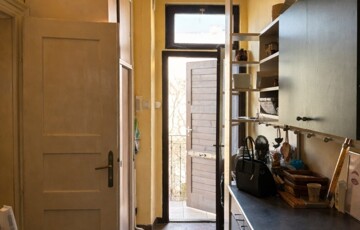 • from the entrance hall–kitchen area, a bright, spacious, sunny room (approx. 26 sqm) opens out, overlooking the green inner courtyard with a panoramic view of the surroundings. it has a southeast orientation and high ceilings (3.65 m) and currently includes a small wooden loft/gallery (2 × 1.60 m).