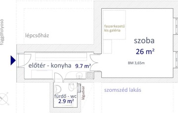 • belső udvari függőfolyosóról nyíló előszoba – konyhatér beépített tároló szekrénnyel beépített konyhabútorral, gáztűzhellyel, melegvíz boilerrel, páraelszívóval,