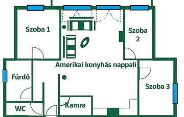 Az amerikai konyhás nappali mellett, előszobával, fürdőszobával külön WC-vel, és 3 hálószobával rendelkező lakás.