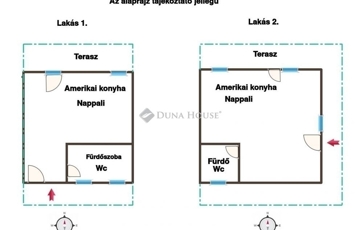 Mindkét lakás: amerikai konyhás nappali + fürdőszoba WC-vel + terasz