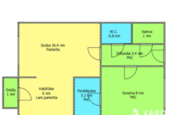 Helyiségei: 1 szoba, 1 hálófülke, konyha, kamra, előszoba, fürdőszoba, külön nyíló W.C., erkély.