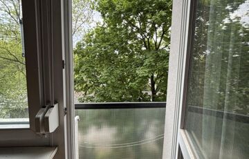 Az ingatlan egy négyszintes társasház első emeletén található, ablakai nem az utcára, hanem egy csendes, fás területre néznek.