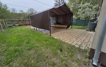 - térkövezett, 2 állásos autóbeálló, mely ponyvával fedett, és a nagy előkertben van