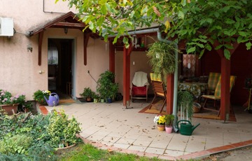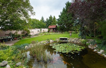 A házhoz egy kényelmes, fedett terasz tartozik, a gondozott kert kitűnő lehetőséget nyújt a pihenésre, kikapcsolódásra, gyönyörködhetünk a halastó és a növények látványában. A kert végében egy kis szerszámok tárolására alkalmas házikó található.