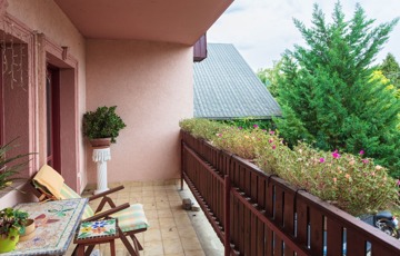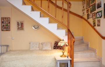 A második, kisebbik lakáshoz egy külső lépcső vezet a felső szintre: 62 nm-en egy amerikai konyhás nappali + háló, kellemes hangulatú 10 nm-es terasz panorámás kilátással, fürdőszobával és egy kis tetőtéri( hálókuckónak, vagy tárolásra alkalmas hely) galériával kiegészítve.