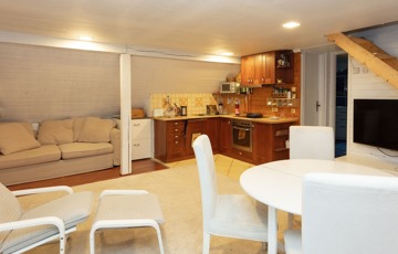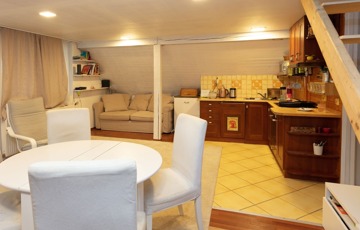 Az alsó lakás 170 nm-es, két szinten helyezkedik el, központi tere egy tágas, világos, amerikai konyhás nappali, melyhez erkély is tartozik. Az előszobából nyílik még két szoba, egy fürdő és egy gardrób, valamint egy belső lépcső visz le az alsó szintre.