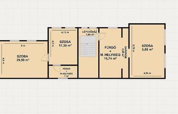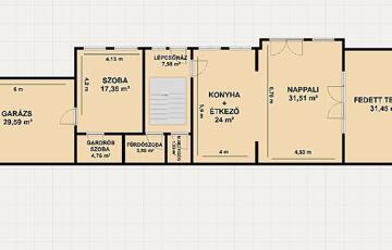 Előszoba, amerikai konyhás nappali, szoba, mosókonyha, külön mellékhelyiség, gardróbszoba, fedett teraszkapcsolat.