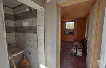 A házban kialakításra került a fürdőszoba, ahol a burkolási munkák elkészültek, a fürdőkád beépítésre került. A víz bevezetve a vizes helyiségekbe, a melegvízellátást villanybojler biztosítja. A villamos hálózat megújult, a villany vezetékek cserélve lettek, az ingatlan 1x16 amperrel rendelkezik.