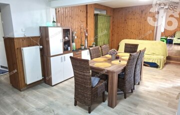 Különlegessége a közel 50 m2-es lambériázott nappali, amiből nyílik a kertre néző hátsó fedett terasz.