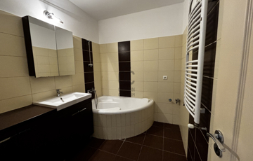 -tágas külön fürdőszoba sarokkáddal, törölközőszárítóval