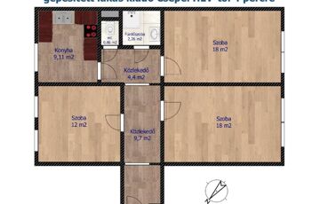 A szobák laminált padlóval, a többi helyiség járólappal burkolt.